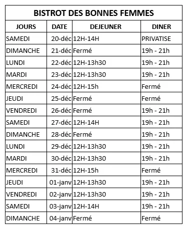 - Nos horaires pour les vacances de Noël :